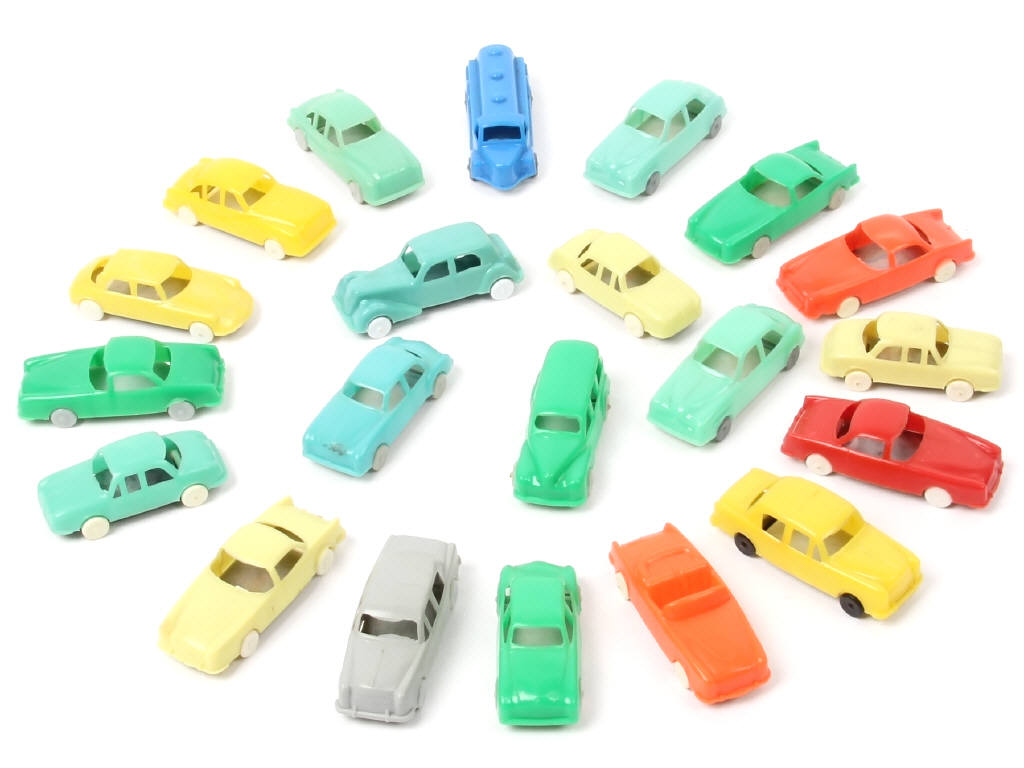 petite échelle - miniatures reproduisant les modèles : CITROËN, PEUGEOT, BERLIET, RENAULT & SIMCA - certains planchers avec marquage TROPICA - très légères traces de colle d'origine par endroits
