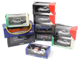 miniatures reproduisant notamment les modèles : NISSAN & ASTON MARTIN (dont un exemplaire Le Mans) - 2 modèles en série limitée - on y retrouve notamment les marques : J COLLECTION, VITESSE, SPARK & EBBRO - quelques suremballages plus ou moins déchirés