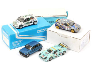 miniatures reproduisant les modèles : RENAULT & SCORA - on y retrouve notamment les marques : JPS, CCC & CHRONO - avec 3 boîtes (état 'c', 2 non d'origine, une tachée) - quelques petits accessoires manquants