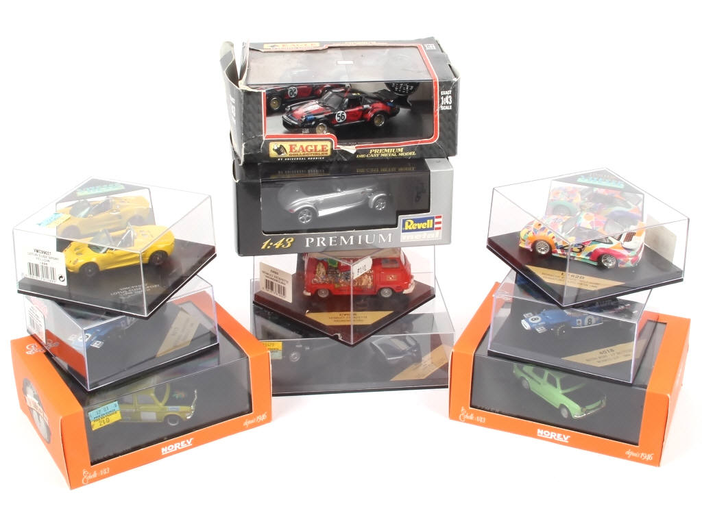 miniatures reproduisant notamment les modèles : SIMCA, PORSCHE, PLYMOUTH & RENAULT (manque un rétroviseur) - on y retrouve les marques : NOREV, REVELL, VITESSE, EAGLE (suremballage déchiré) & QUARTZO
