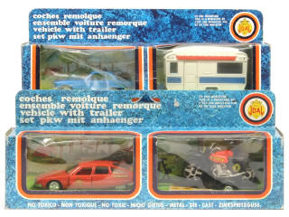 comprend : MERCEDES BENZ 350SL avec caravane & CITROEN CX avec moto cross MONTESA sur remorque - blisters froissés