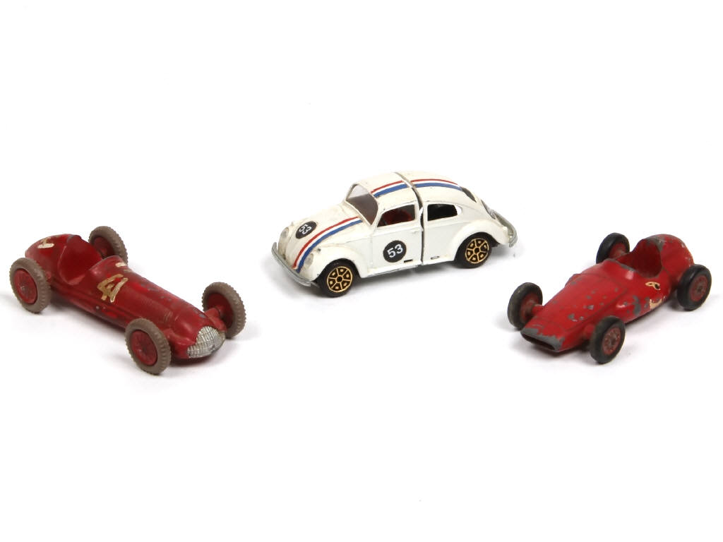 comprend : VOLKSWAGEN tiré du film de Walt Disney 'UN AMOUR DE COCCINELLE' (mécanisme fonctionne - manque banquette arrière), ALFA ROMEO ALFETTA GRAND PRIX & FERRARI SUPERSQUALO - avec manques & parties cassées