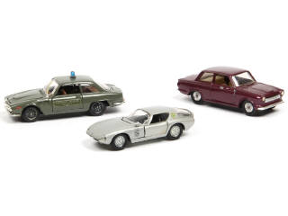 comprend : ALFA ROMEO GIULIA 1600, ALFA ROMEO 2600 'SQUADRA MOBILE (manque pellicule chromée sur antenne) & FORD CONDUL CORTINA (une portière en état 'c')