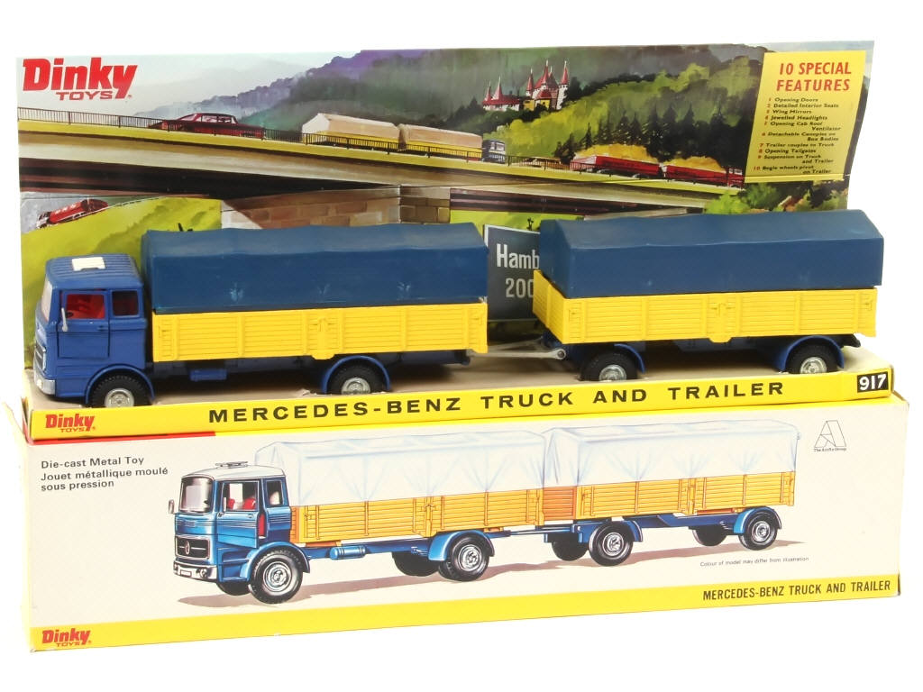DINKY TOYS (GB) 917 MERCEDES Bâché avec remorque bâchée bleu foncé & jaune, bâches bleues