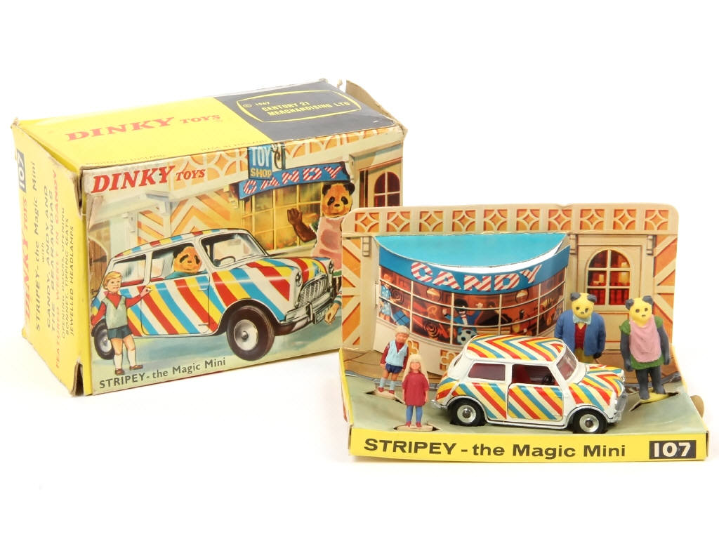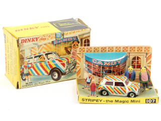 DINKY TOYS (GB) 107 MINI MINOR 'STRIPEY THE MAGIC MINI' blanc à chevrons bleus, jaunes & rouges