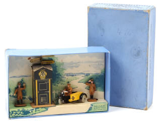 produit de 1935 à 1940 - comprend une cabine en tôle 'AA' référence 44A (dessous du socle terni, petites traces d'oxydation par endroits), side-car 'AA' référence 44B (pneus séchés), guide saluant référence 44D & trafic-guide référence 44C - boîte décolorée & plus ou moins tachée par endroits (avec cale de fond illustrée)