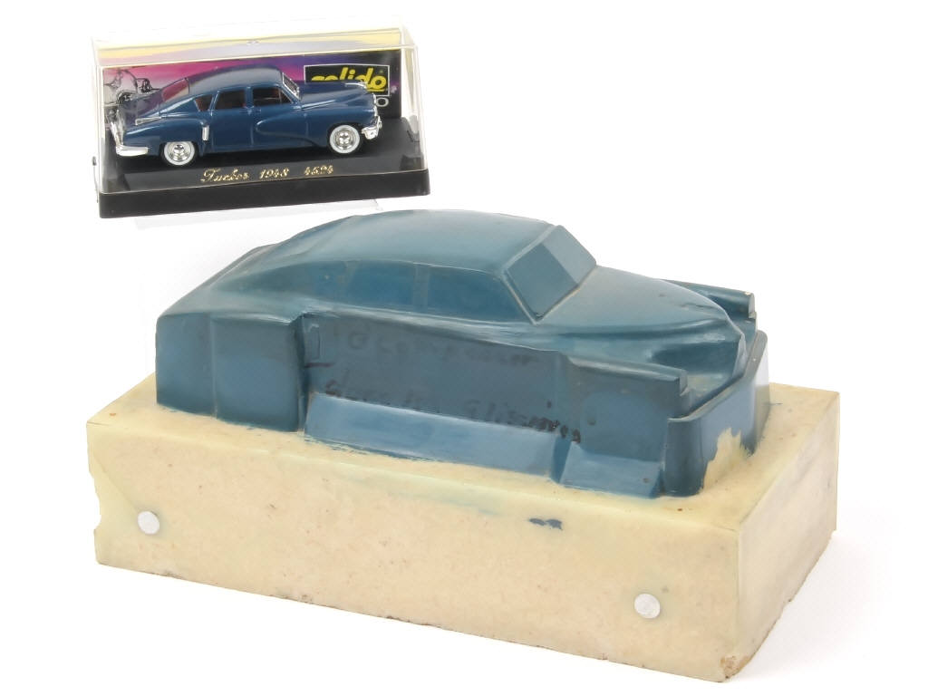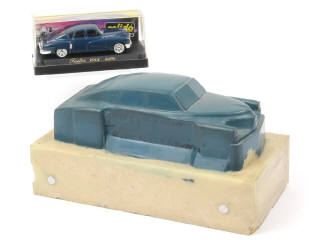 longueur 27 cm - réalisation en résine - inscriptions au feutre sur les côtés de la carrosserie - quelques fêlures plus ou moins importantes sur le socle (quelques petits manques de matière) - les maître modèles servaient à la fabrication des moules, il étaient fait en résine, bois, aluminium ou plâtre à une échelle double ou triple du futur modèle - pièce récupérée lors de la fermeture de l'usine - MODELE UNIQUE ! - on y joint la véritable miniature issue de cette étude (état 'A+.b', une petite fêlure sur le couvercle)