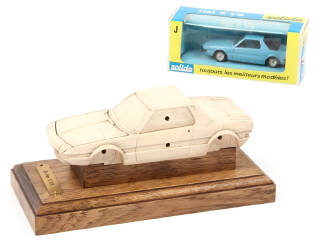 longueur 21 cm - réalisation en résine sur socle en chêne - petits frottements sur la carrosserie - les maître modèles servaient à la fabrication des moules, il étaient fait en résine, bois, aluminium ou plâtre à une échelle double ou triple du futur modèle - pièce récupérée lors de la fermeture de l'usine - MODELE UNIQUE ! - on y joint la véritable miniature issue de cette étude (état 'A+.a', jantes fondues)