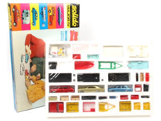 semble complet - dimensions : 55 x 38 cm - ensemble interchangeable à monter - contient : PEUGEOT 504, OPEL COMMODORE, RENAULT 16, FORD TAUNUS pick-up, caravane, canot, remorque, différents accessoires & notice - sous film plastique (en grande partie déchiré) - un enfoncement sur un coin de boîte