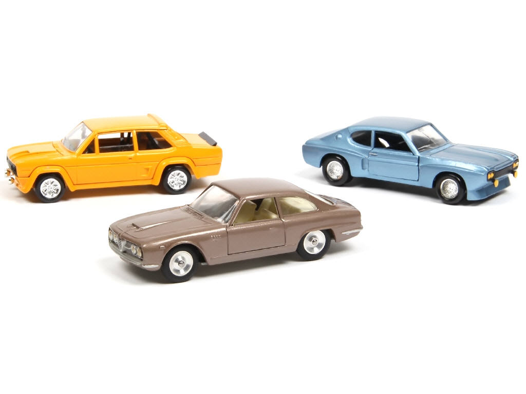 comprend : ALFA ROMEO 2600 (version avec phares moulés & intérieur crème), FORD CAPRI 2600 RV (sans décalques) & FIAT ABARTH 131 rallye (sans décalques)