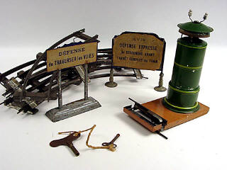 hauteur 20,5 cm - mécanisme à clef (fonctionne) - avec clef - le passage du train déclenche la sonnette grâce à un patin - on y joint un ensemble de 6 rails en écartement I