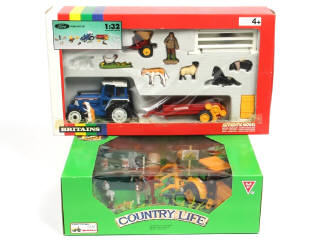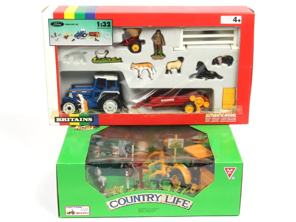 contient : FORD 5610 tracteur agricole, remorque MASSEY-FERGUSSON, , fermier, différents animaux & différents accessoires - ruban adhésif par endroits sur la boite (avec petits manques de papier) - on y joint un coffret agricole 'COUNTRY LIFE' de marque indéterminée