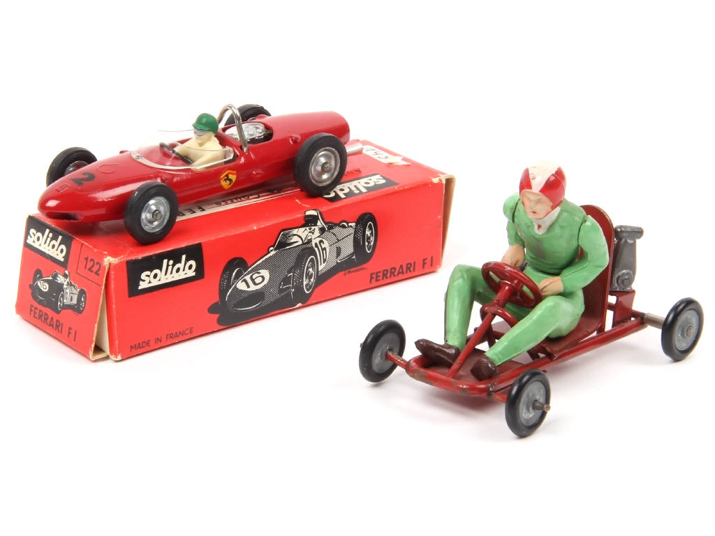avec pilote en combinaison verte, casque rouge avec rayure centrale blanche (coulure de peinture marron d'origine sur une jambe) - axes de roues légèrement déformés - éclats plus ou moins importants par endroits avec légères traces d'oxydation - pneus séchés - il s'agit de la troisième & dernière référence de P.R. après les camions 'WATERMAN' & 'SAVON AMBRE - LE CHAT'