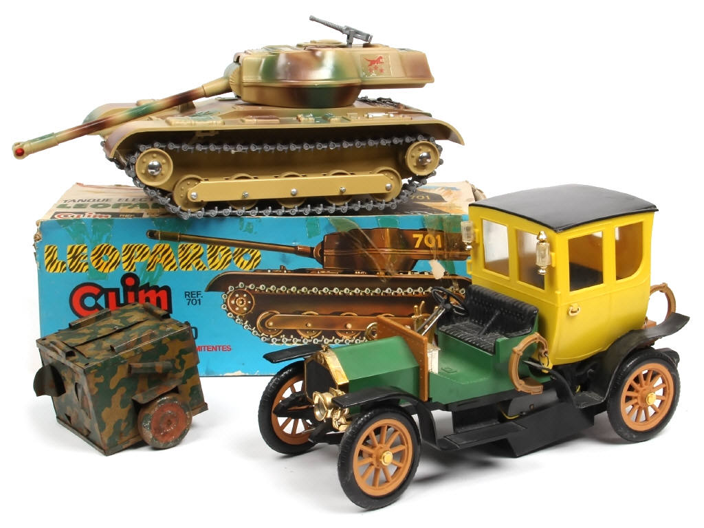 longueurs environ 30 cm - moteurs à clef (non testés) - un modèle avec système lumineux (fonctionne) - avec manques, parties cassées & oxydées (dont un compartiement à piles) - on y retrouve notamment les marques GUISVAL & CLIM (boite en état 'd' référence 701)