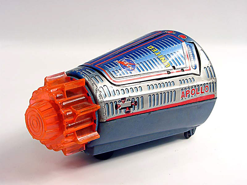 longueur 24 cm - en action la capsule avance en contournant les obstacles - le nez de l'appareil s'éclaire & 2 panneaux s'ouvrent laissant apparaître un cosmonaute - avec bruiteur - mécanismes fonctionnent - manque une vis de fixation - in action, the capsule moves forward avoiding all obstacles - the front of the vehicle lights up & 2 doors open to reveal a cosmonaut - with sound effects - in working condition - fixture screw missing