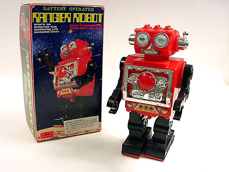 hauteur 25 cm - en action, le robot avance puis s'arrête tandis que ses canons tirent & que le rond central de son torse s'écaire - avec bruiteur - mécanismes fonctionnent - in action, the robot moves forward, then stops to fire - the red spot on his chect lights up - with sound effects - in working condition