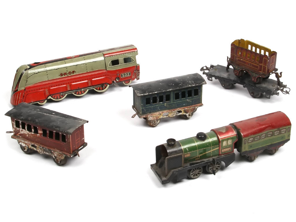 2 moteurs à ressort dont un à revoir - comprend notamment : locomotive à vapeur type 231 en tôle lithographiée (RARE ! - longueur 27 cm), type 020 3615 & voitures-voyageurs - avec manques, parties cassées, déformées & oxydation - on y retrouve les marques : MEMO & HORNBY