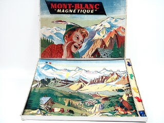 dimensions : 43 x 35 cm - contient un plateau de jeu, 4 alpinistes de couleur différente & 2 dés - le jeu consiste à arriver le premier au sommet du Mont-Blanc - provient d'un fond de magasin - 43 x 35cm - contains a game's tray, 4 various coloured mountain climbers & 2 dice - the aim of the game is to get to the top of Mont Blanc before the others - original shop stock