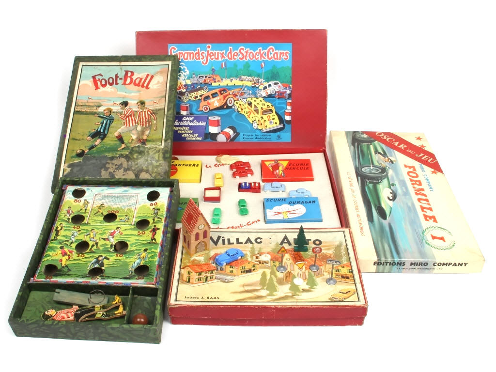 semblent complets - plusieurs notices présentes - comprend : FORMULE 1, FOOT-BALL & GRANDS JEUX DE STOCKCARS - on y retrouve notamment les marques : LA TOUR SAINT-DENIS, MIRO & JOUETS J.RAAS - avec manques & parties cassées - boites en états de 'b' à 'c' (dont une avec manques de papier & traces d'humidité)