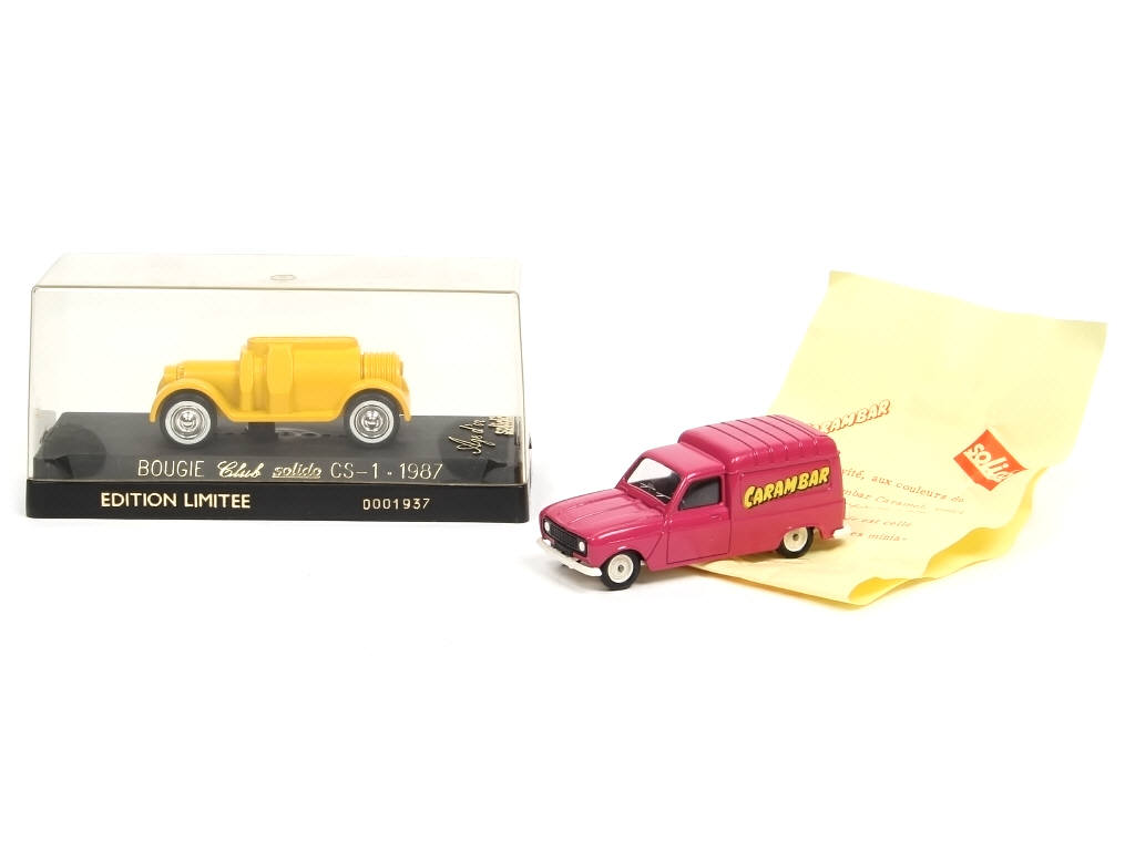 comprend : RENAULT 4 CV fourgonnette 'CARAMBAR' (avec rare dépliant de la marque daté d'août 1978 présentant le modèle promotionnel - plus ou moins froissé - légères traces de papier bulles sur la carrosserie par endroits) & BOUGIE 'CLUB SOLIDO' CS-1 1987 (série limité numéroté 1937 - boite en état 'b')