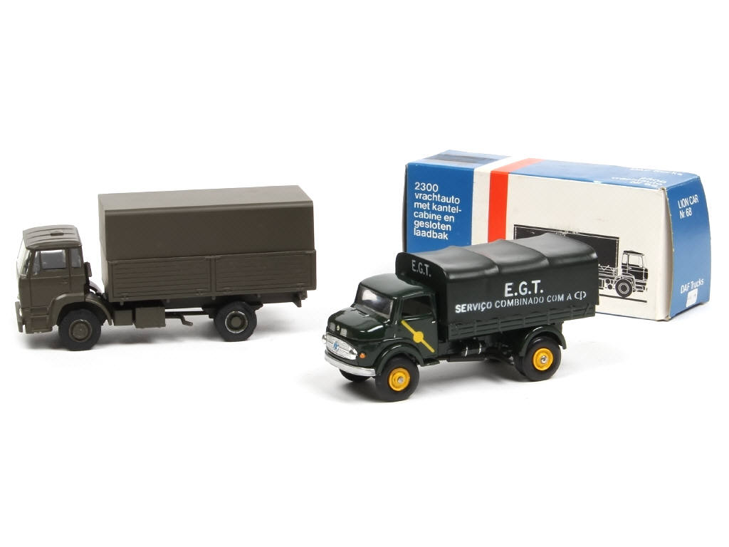 comprend : DAF 1900 bâché & MERCEDES 1113 Bâché 'E.G.T.' (un élément cassé à recoller - petits manques sur certaines jantes - sans boite)