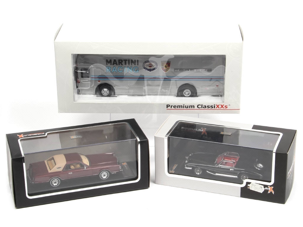 éditions limitées - comprend : STUTZ - BLACKHAWK convertible 1971, LINCOLN CONTINENTAL MKV 1979 & MERCEDES BENZ - truck transporter PORSCHE 'MARTINI RACING' - on y retrouve les marques : PREMIUM X & PREMIUM CLASSIXXS - étiquettes sur les boites