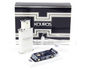 contient : une bouteille d'eau de toilette (100 ml, pleine) & une MERCEDES de course 1986 'YSL' (échelle 1/43ème)