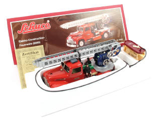 réédition de 2002 - semble complet - longueur 31 cm - avec moteur à piles (non testé), avertisseur à clef (fonctionne), 3 pompiers, sachet d'accessoires, notice, certificat d'édition limitée à 1999 exemplaires, boîtier de piles & câblage - TRES BELLE REALISATION !