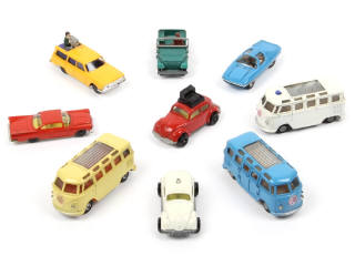 petites échelles - miniatures reproduisant notamment les modèles : VOLKSWAGEN, STUDEBAKER & BUICK - on y retrouve les marques : HUSKY (dont un exemplaire tiré de la série 'UNCLE'), LONE STAR & CORGI TOYS - quelques petits accessoires manquants