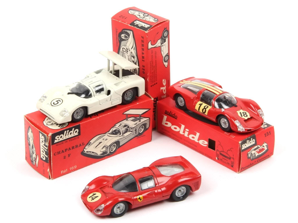 comprend : FERRARI 330 P3 (état 'B'-'b'), CHAPARRAL 2F (état 'A'-'c', manque une languette d'un rabat de boîte) & PORSCHE CARRERA (état 'A'-'a', manque un rétroviseur & petites parties de décalques)