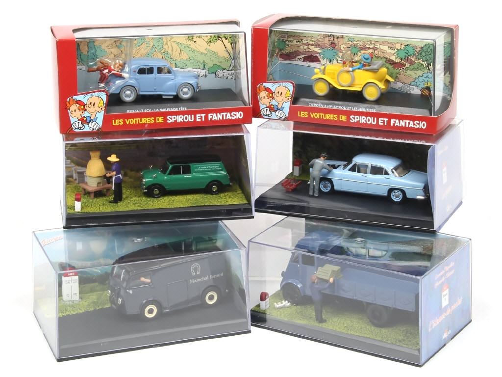 comprend les collections 'LA ROUTE BLEUE' & 'LES VOITURES DE SPIROU & FANTASIO' - on y retrouve les marques : ALTAYA & ATLAS - un capot moteur à recoller - certains couvercles de boites fêlés
