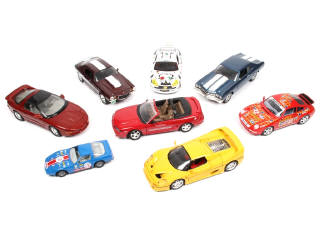 différentes échelles - comprend les notamment les modèles : CHEVROLET, FERRARI & PORSCHE - on y retrouve notamment les marques : POLISTIL, BBURAGO, MAISTO & ERTL - certains exemplaires avec parties cassées & manquantes