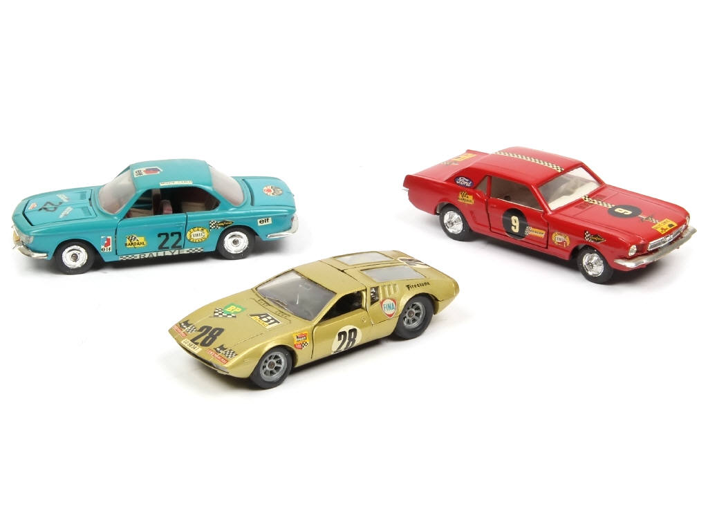 comprend : FORD MUSTANG (non testé), DE TOMASO MANGOUSTE & BMW 2000 CS - avec parties plus ou moins ternies & encrassées - décalques ajoutés