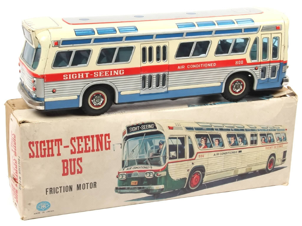MASUDAYA TOYS Co. (JAPON) 3483 GM Autocar en tôle lithographiée crème, bleu & gris