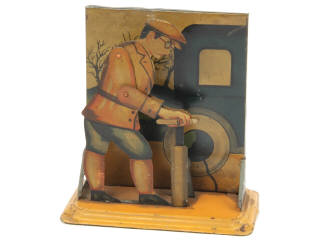 dimensions : 11 X 7 X 12 cm - une manivelle permet de faire bouger les bras & le haut de la pompe à main afin de simuler le gonflage d'une roue - très légères déformations avec petites traces d'oxydation (principalement sur le socle avec une petite perforation)