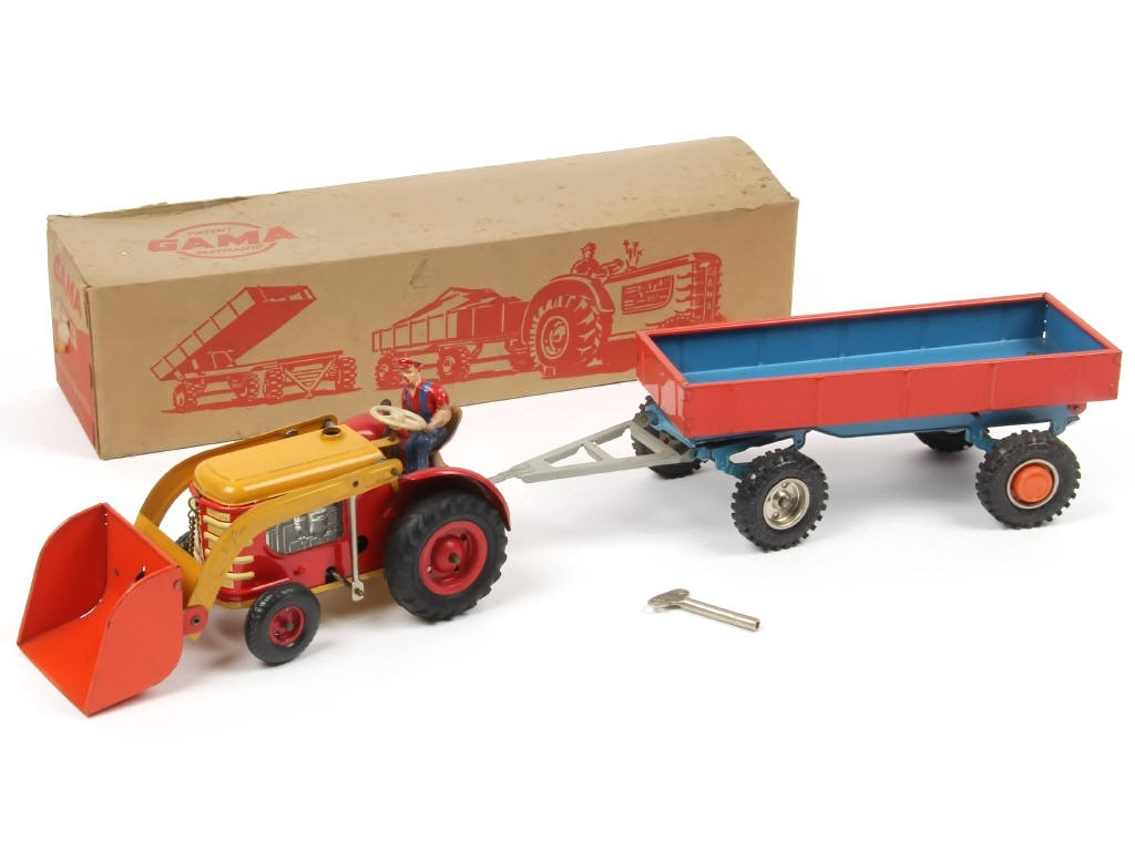 GAMA (ALLEMAGNE) 1754 Tracteur agricole avec pelle & remorque à 2 essieux en tôle peinte rouge, jaune & bleu