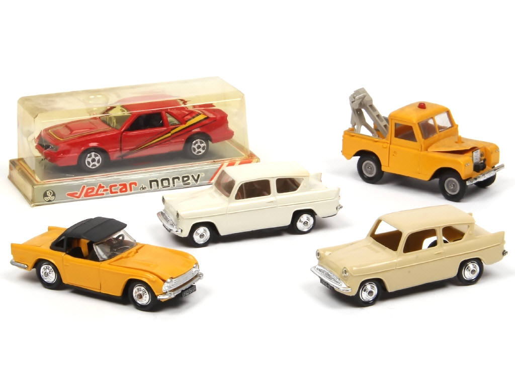 comprend : LAND ROVER, FORD ANGLIA, MUSTANG, TRIUMPH TR5 - quelques déformations, jantes fondues & pneus séchés - un modèle avec traces d'humidité