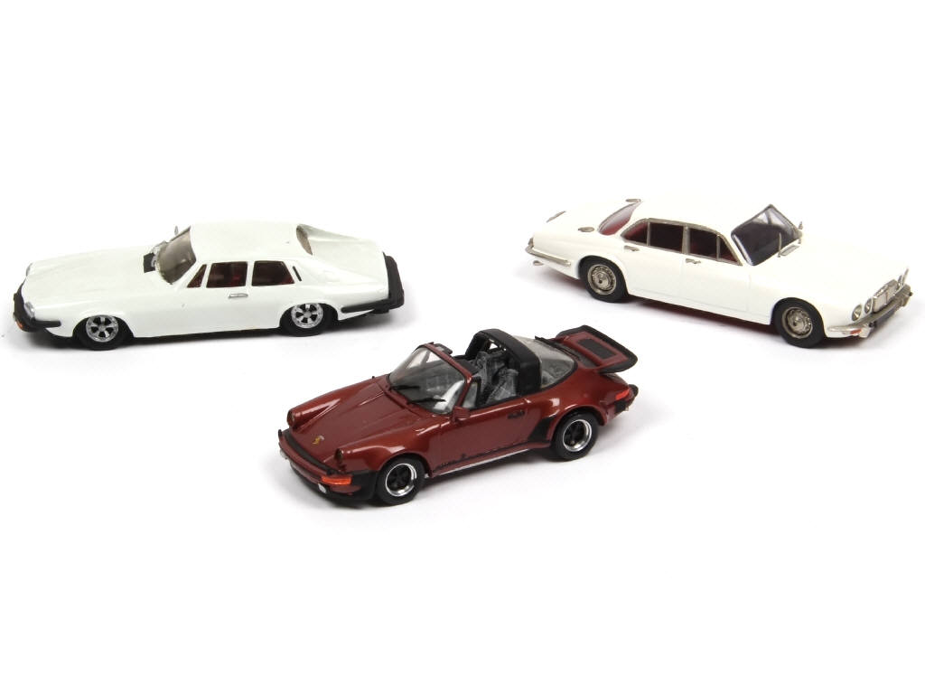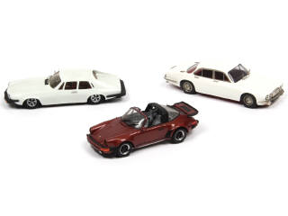 comprend : JAGUAR XJ-S 1975PORSCHE TURBO TARGA (série limitée numéroté 4/79 exemplaires - aménagement intérieur avec traces d'humidité) & DAIMLER DOUBLE SIX (série limitée numéroté 68/300 exemplaires) - on y retrouve les marques : MRF, AMR & GRAND PRIX MODELS