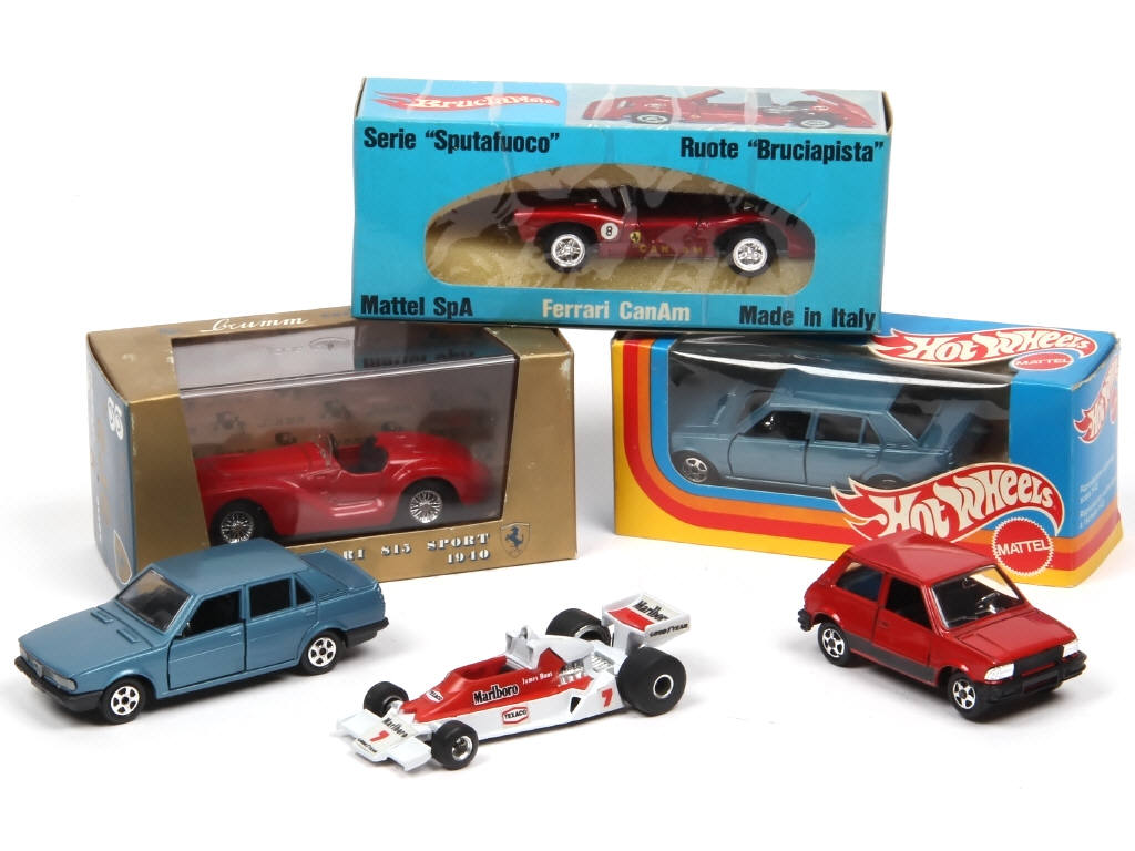 comprend notamment : FERRARI CAN AM, HP 75 1940, ALFA ROMEO GIULIETTA & Mc Laren M26 - 3 modèles en boite état 'b' - on y retrouve les marques : YAXON, MEBETOYS, MATTEL & BRUMM - un modèle avec axes de roues tordus & bloqués