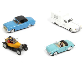 comprend : CITROEN 5HP, PEUGEOT 403 (manque de pellicule chromée sur les pare-chocs - baguette recollée avec traces de colle visible sur le capot), 203 ambulance 'HOSPICES CIVILS DE LYON' & RENAULT 4CV BRISSONNEAU & LOTZ (pare-brise avec fixation légèrement déficiente) - on y retrouve les marques : E.C.F., JMK, VEREM & LEADER - quelques petits éléments avec légères déformations