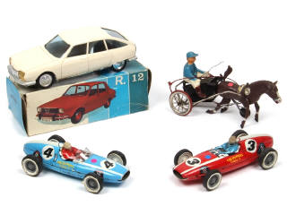3 moteurs à friction & un à clef (fonctionnent) - différentes compositions - avec manques & parties cassées - quelques parties oxydées & jantes plus ou moins fondues - un modèle en boite état 'c' - on y retrouve notamment les marques : VERCOR, RICO & MARCHESINI