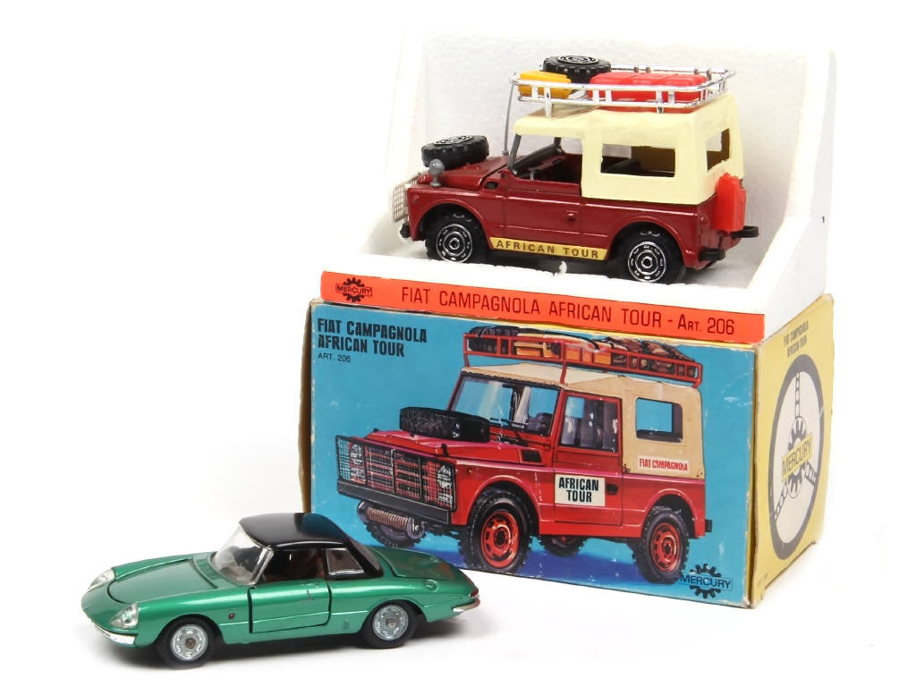 comprend : FIAT CAMPAGNOLA AFRICAN TOUR (boite en état 'b') & ALFA ROMEO DUETTO cabriolet (COULEUR PEU COURANTE ! - une éraflure sur une portière)