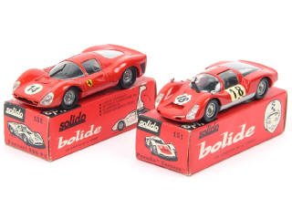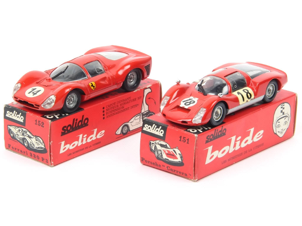 comprend : PORSCHE CARRERA (état 'A'-'b', très légers manques sur 2 décalques) & FERRARI 330 P3 (état 'A-'c', détails de peinture noire ajoutés, essuie-glace cassé & incomplet, traces de papier collé sur une face de boîte)