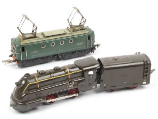 comprend : locomotive à vapeur type 120 avec tender (moteur à clef fonctionne) & motrice BB-8101 (non testé, parties retouchées) - avec manques, parties cassées & plus ou moins déformées - traces d'oxydation