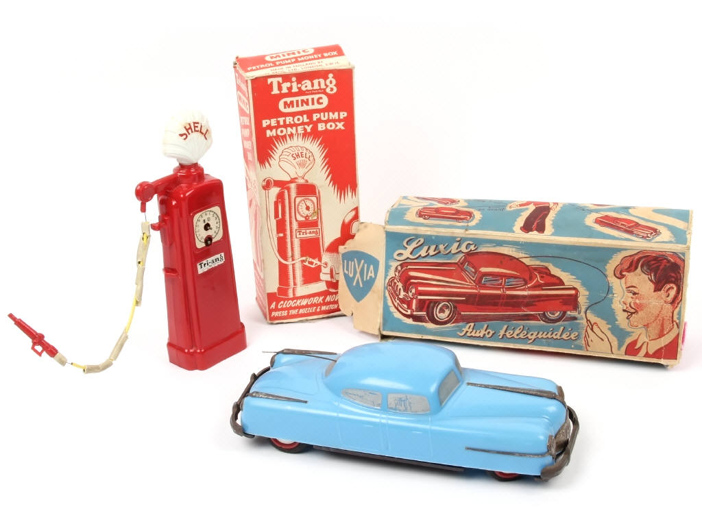 longueur : 25 cm - réalisation en plastique - parties chromées ternies avec traces d'oxydation - on y joint une colonne à essence 'SHELL' de la marque MINIC (état 'C'-'d', système à clef à revoir) - avec manques & parties cassées