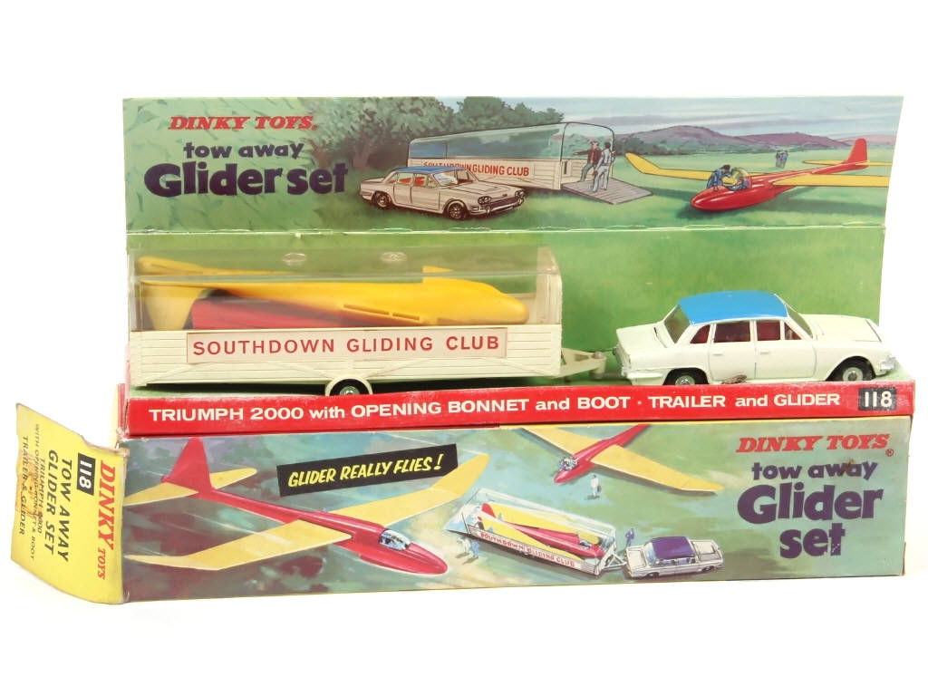 DINKY TOYS (GB) 118 TRIUMPH 2000 & Remorque avec planeur crème, toit bleu