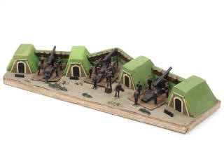 production du début du XXème siècle - dimensions : 74 x 32 x 10 cm - états de 'A' à 'B' - contient : 12 artilleurs, 2 chefs de pièces, 3 officiers, 3 obusiers, 4 grappes de 5 obus, 4 façades, 5 végétations & 8 éléments de décors en carton & bois (plus ou moins élimés) sur socle (parties cassées & recollées) - manque 3 figurines & quelques petits accessoires