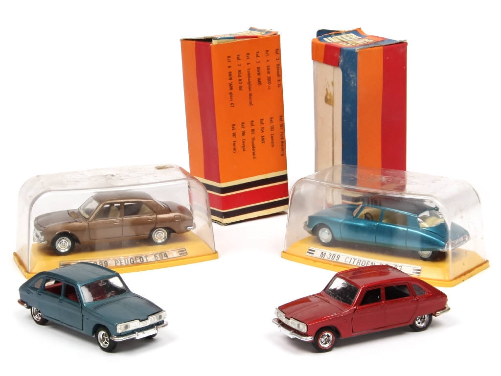 comprend : CITROEN DS 23, RENAULT 16 & PEUGEOT 504 - quelques jantes légèrement fondues - petits manques de pellicule chromée sur un modèle - on y retrouve les marques : NACORAL (série INTER-CARS - fabriqué en Belgique) & PILEN - boites plus moins encrassées en états 'b' & 'c'