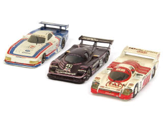 comprend : MERCEDES KOUROS, FORD MUSTANG & PORSCHE 956 - carrosseries plus ou moins encrassées - quelques petits manques sur certains décalques