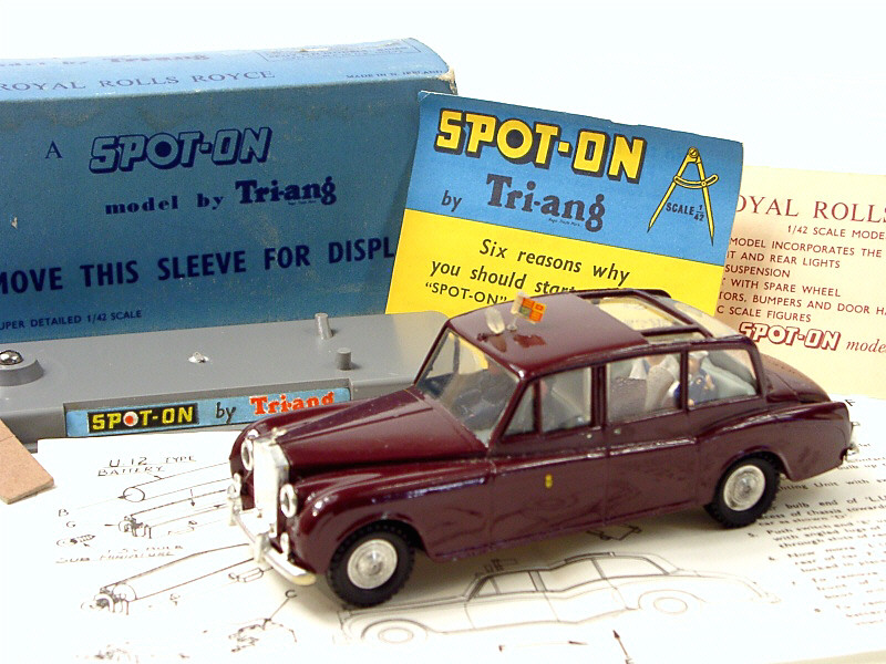 lame du logement de pile resoudée - figurines représentant la famille royale - version boîte-vitrine avec socle de présentation & rare sur-emballage - bulletin d'inscription au club SPOT-ON & notice d'instructions concernant la mise en place du système d'éclairage - rare carte de collection SPOT-ON avec l' illustration de BUCKINGHAM PALACE & les caractéristiques du modèle